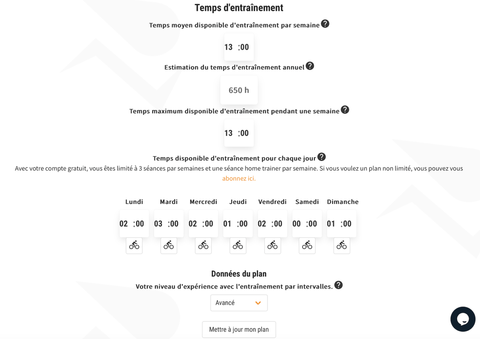 Rentrez vos disponibilités chaque semaine ainsi que vos nombres d'heures par séance et voyez votre plan d'entraînement calculé automatiquement. Vous pourrez le modifier comme vous le voulez selon l'offre choisie. Home trainer ou sorties en extérieur, chaque séance est calculée selon votre ou vos objectifs dans l'année